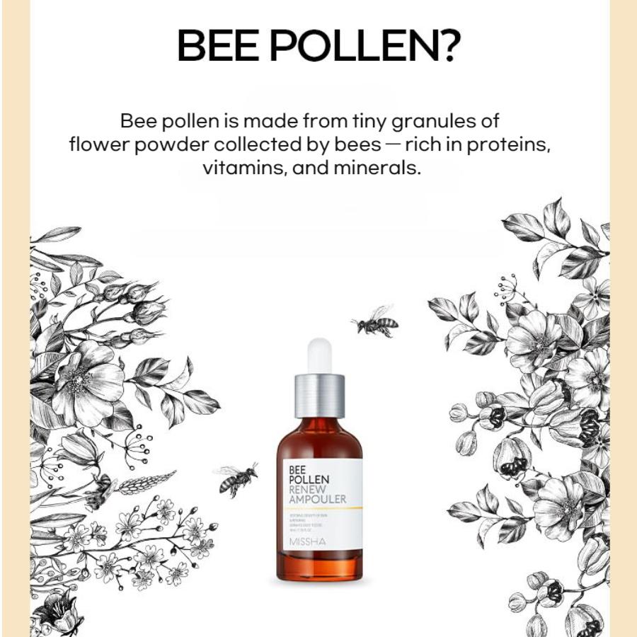 MISSHA Bee Pollen Renew Ampouler is a highly concentrated ampoule infused with 42% Bee Pollen Extract to deliver nourishment and vitality to tired, stressed skin.