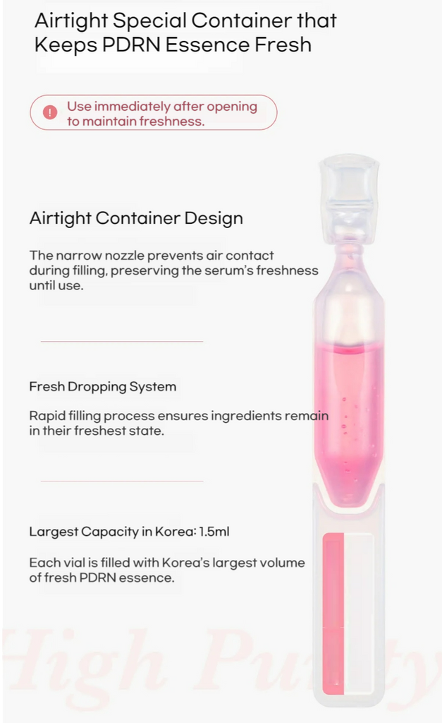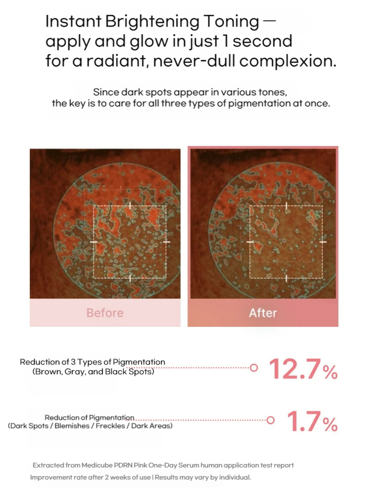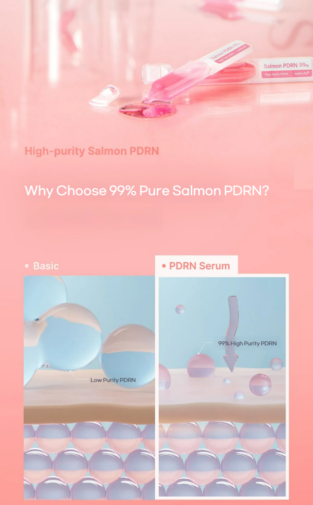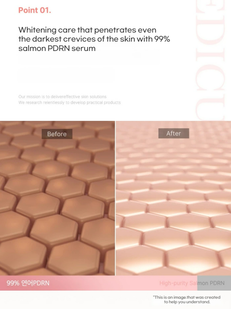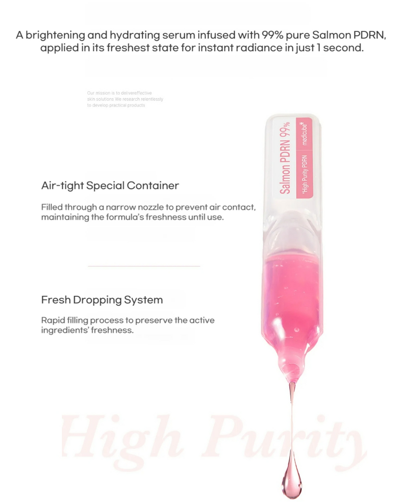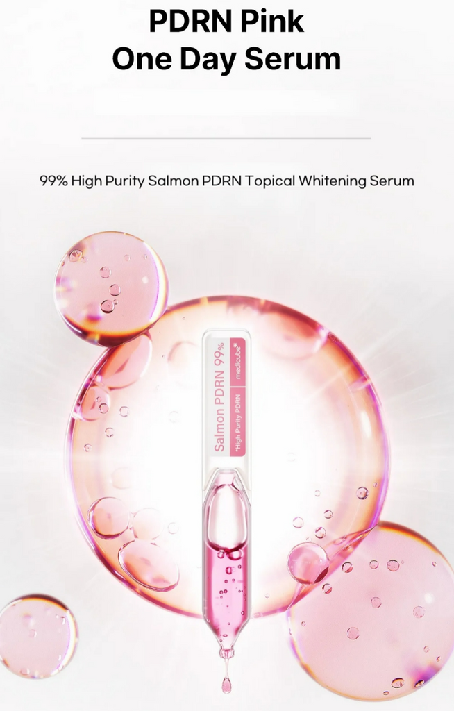 The High-Purity Salmon PDRN Pink One-Day Brightening Serum delivers a radiant glow and helps improve skin tone.